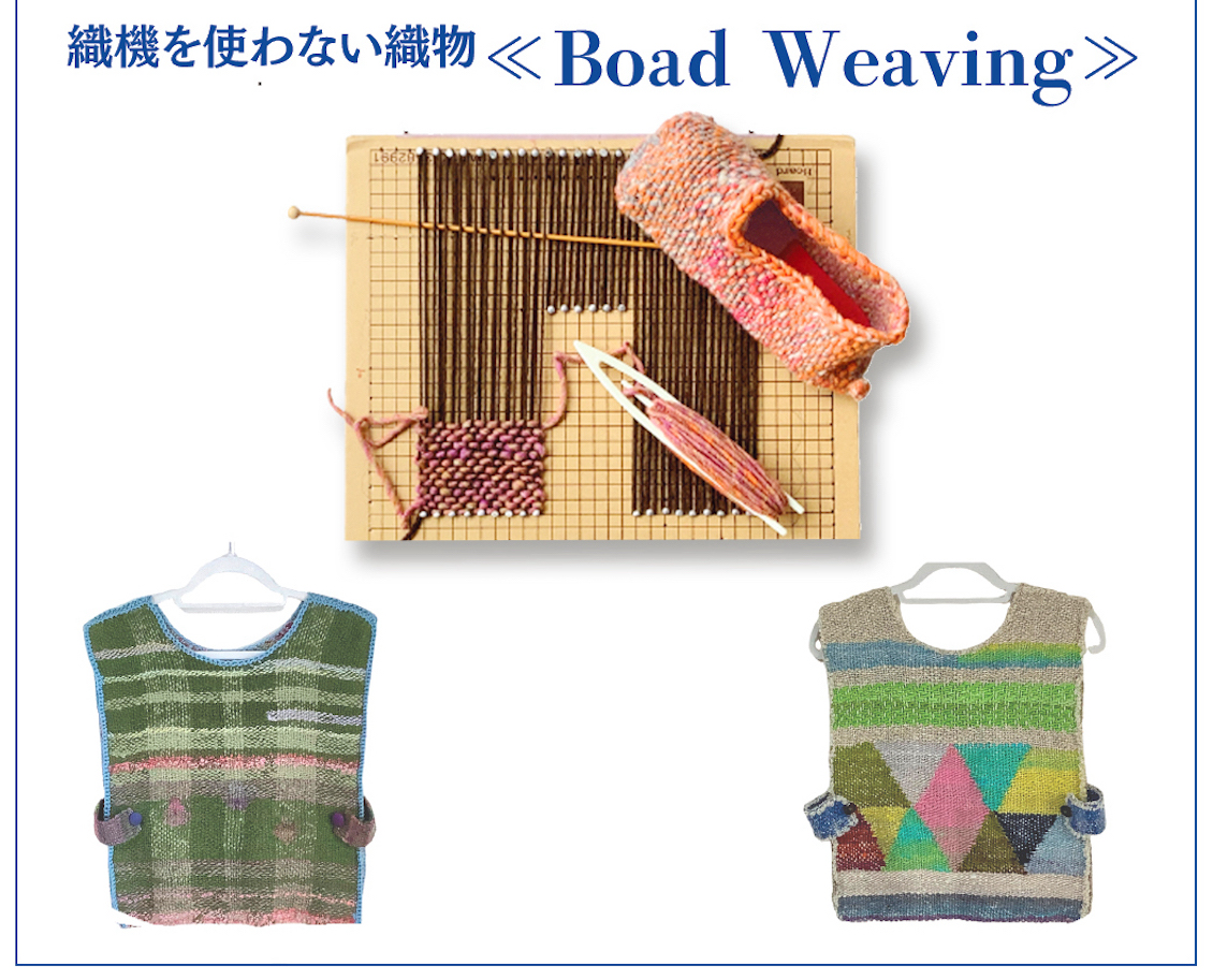 ボードウィービングは、専用の段ボールに専用のピンとキャップを使い、たて糸をかけて織る織物。