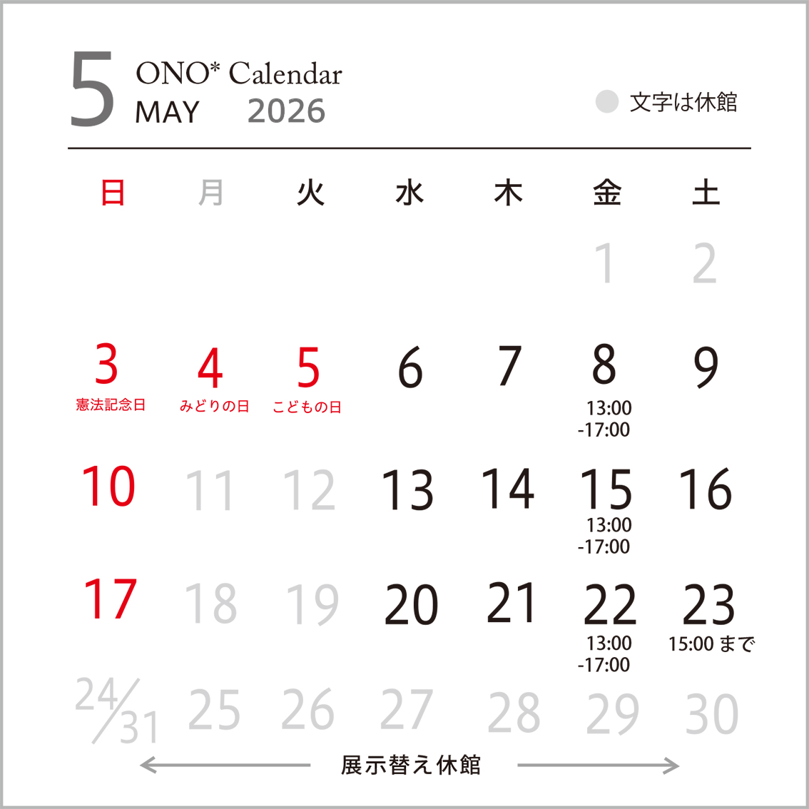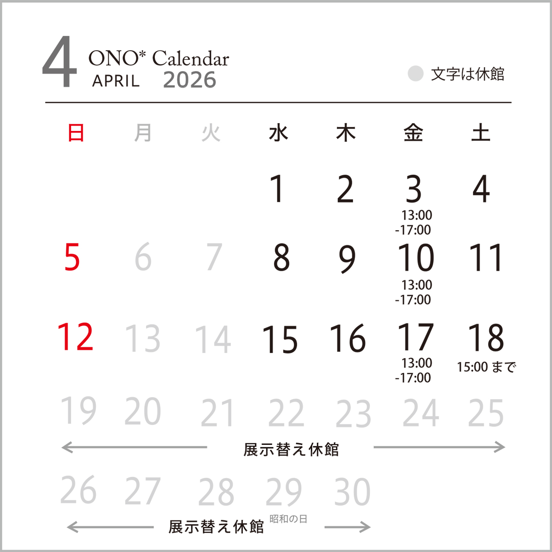 *ONO* 2026年 上半期 OPEN カレンダー*